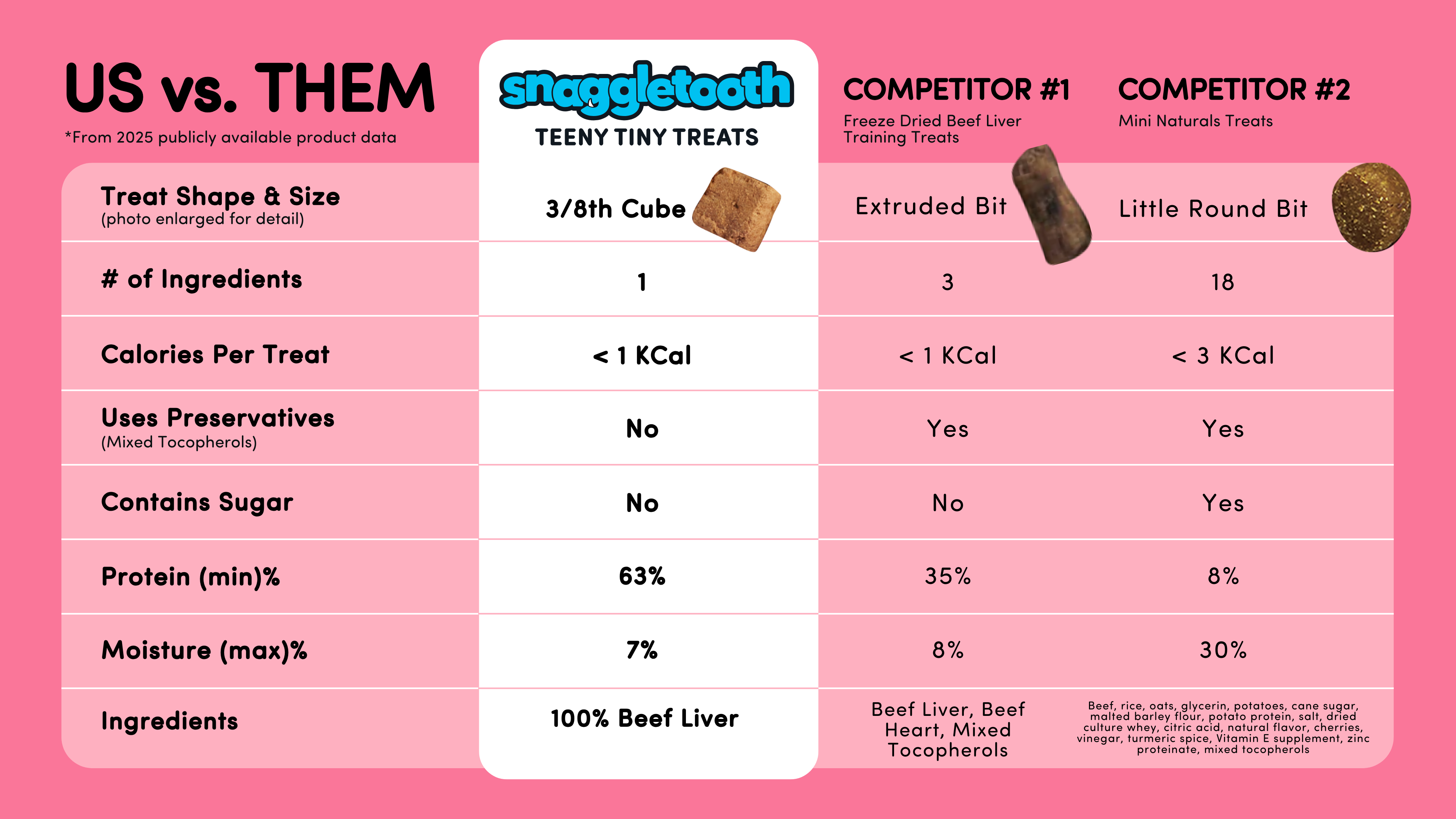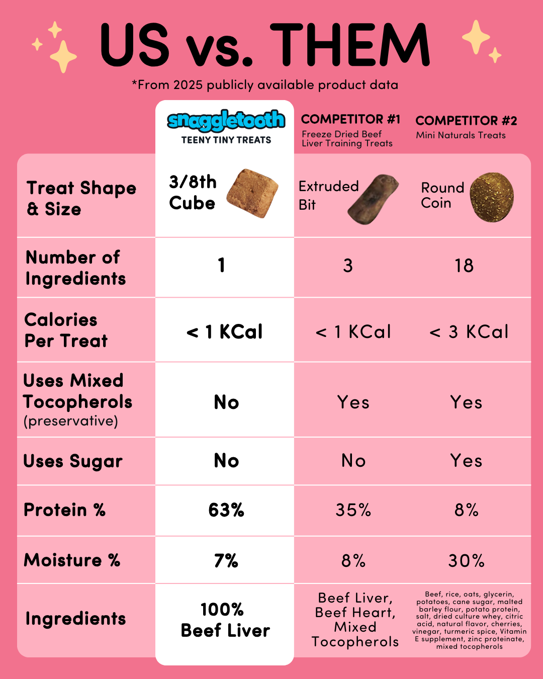 Our freeze dried treats are less than 1 calorie each & 100% made in USA with human-grade USDA proteins.