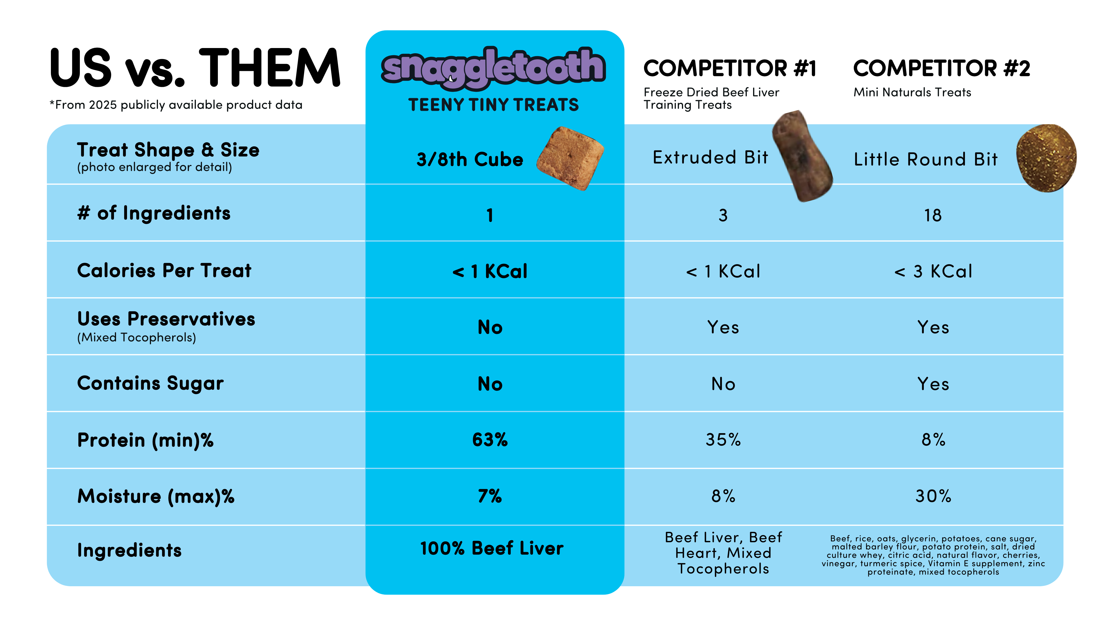 You’ve seen teeny treats. You may have even seen tiny treats. But our teeny tiny treats are the perfect size for any kind of pet. Each treat is roughly a ⅜” cube—something you’ll be hard-pressed to find anywhere else. They’re small enough to keep the structure but large enough to pack a flavor punch.